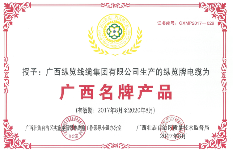 授予廣西縱覽線纜集團(tuán)有限公司生產(chǎn)的縱覽牌電纜為廣西名牌產(chǎn)品